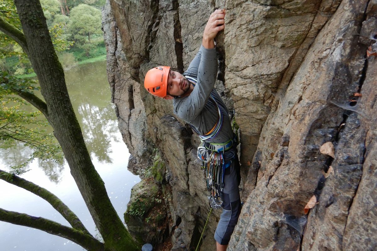 Cinkot vklíněnců na sedáku / Lezení tradiční skalní cesty